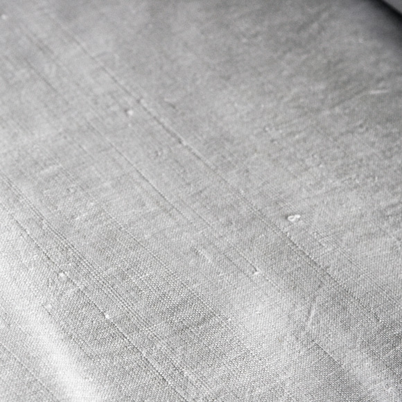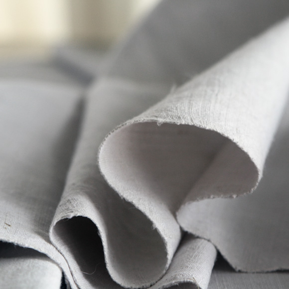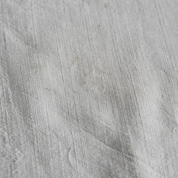 こちらも中厚手の張りのあるキシっとした生地です。 自然な茶色の繊維も所々に混ざっており、色味も織目も異なるとっても素朴なアンティークリネン。 くすんだほんのりのグレーは古布ならでは。両端に2ケ所づつループが付いています。働くためにストックされていたリネンの反物。