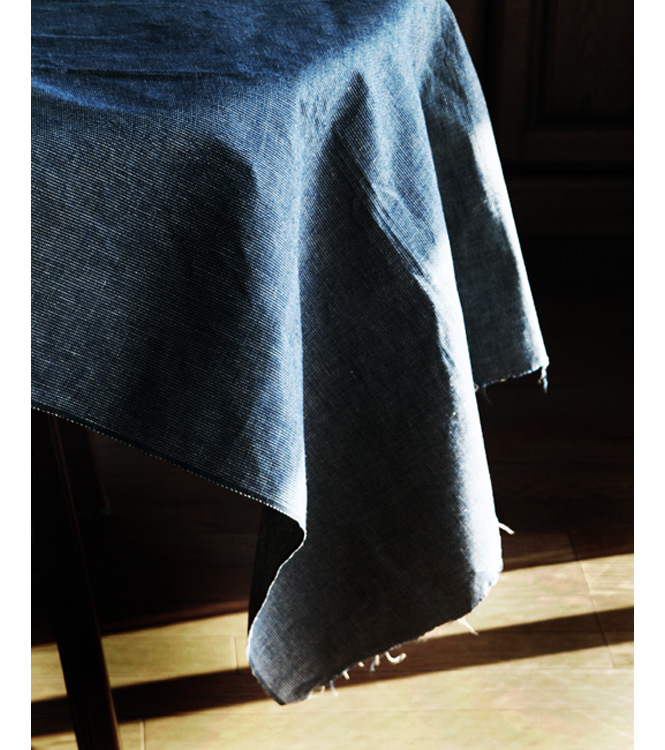 タブリエとしてスタンバイされていたリネンとコットンのメティス生地。 帯のような張りと、厚紙のような不思議な感触。 藍と白の細かな織り、所々に見える糸の吊り。 目にして、手にして、とっても存在感のある生地です。