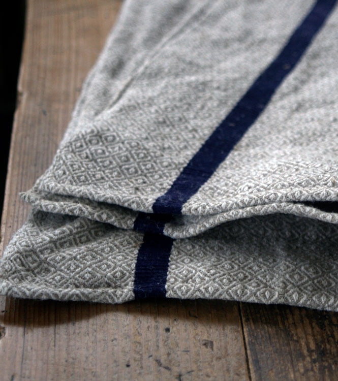 牛の目と呼ばれる小さな菱形のバスク織り。 1.5cm幅の濃紺のラインは両サイドに2本。 52cmの幅は織端、上下は手縫いでトーションサイズに仕立てられています。 目がしっかり詰まっている厚手の生地でとっても丈夫。少し弾力も感じます。 厚手のバスクリネン生地にはあまり巡り会えないんです。 ベージュの色味と濃紺、そして生地の厚みが格好いい、甘くないバスクリネンです。
